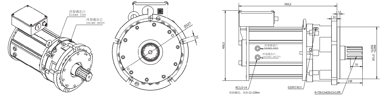 产品特点:高效散热、冷却液进出口可互换,动态响应速度快、低速平稳性好、转动惯量小、噪声低。